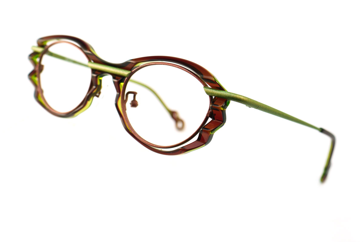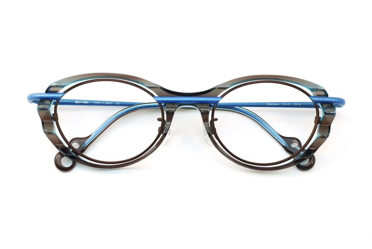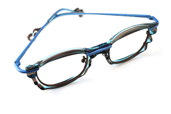 「扇子」のようなフォルムやカラーリング、チタンとアセテートとのコンビネーションなど、いろいろな角度から眺めてみたくなる「遊び心」あふれるフレームだ。