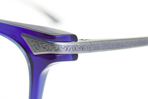 チタンとアセテート(※)の巧みなコンビネーション、1920年代の宝飾品をモチーフにした繊細な彫金模様、高田賢三氏の家紋である桔梗を採り入れたデザインなど、卓越した技術とセンスが見事に融合したコレクションだ。