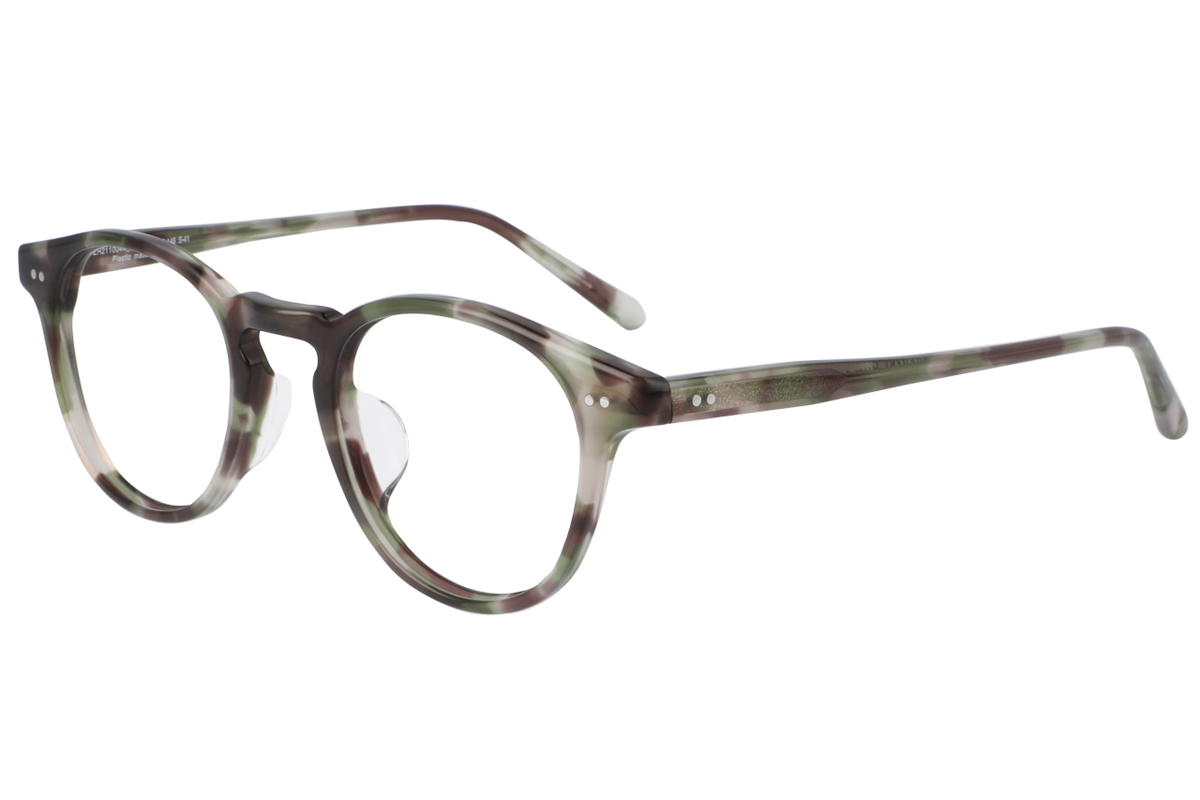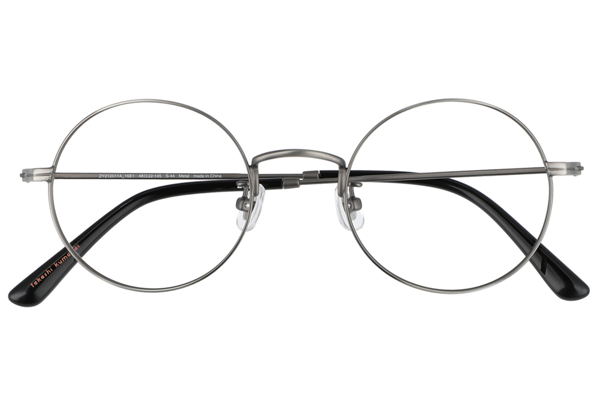 カシメ丁番(※1)を模したパーツやキーホールブリッジ(※2)など、クラシックなモチーフを取り入れた、小ぶりなアメリカンレトロシェイプのフレーム。独特のたたずまいを演出する、絶妙な配色にも注目。