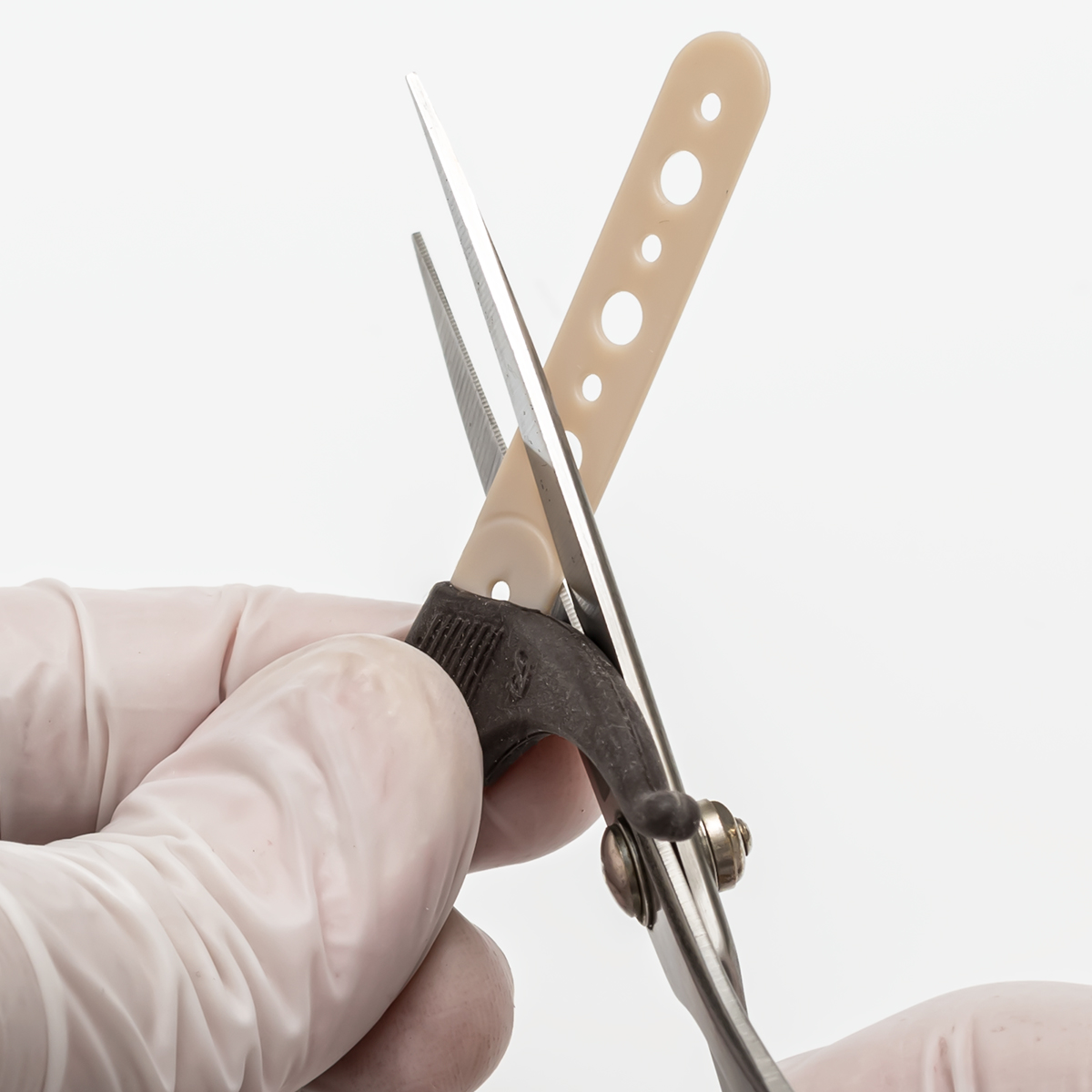 テンプルの長さもハサミでカットして調節できる。カットする目安のラインが2か所に入っている。