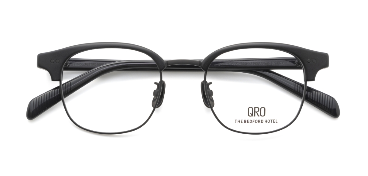 QRO(クロ)のフレームは、テンプル(つる)の印字や細かな金属パーツまで黒で統一されている。黒で統一することで、端整なたたずまいを見せる。