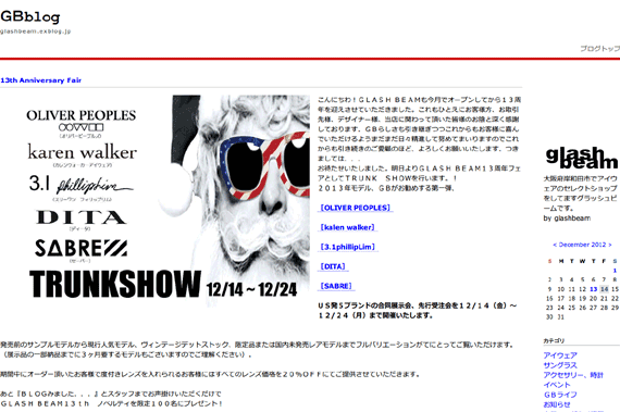 大阪府岸和田市のメガネ店 GLASH BEAM(グラッシュ ビーム)では、開店13周年を記念して、アメリカ発の下記5ブランドのトランクショーを12月24日(月)まで開催中。期間中にフレーム+度付きレンズを注文すると、全てのレンズ価格が20%OFFになるのもうれしい。