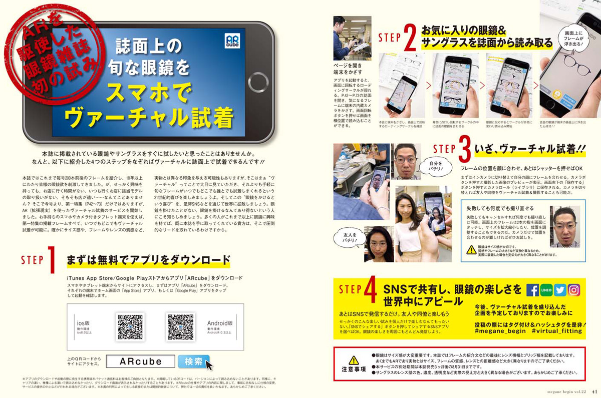 世界文化社より5月31日(水)に発売する『眼鏡Begin vol.22』では、ARを駆使した眼鏡雑誌初の試み!本誌に掲載されている眼鏡やサングラスをスマホでヴァーチャル試着することができます。