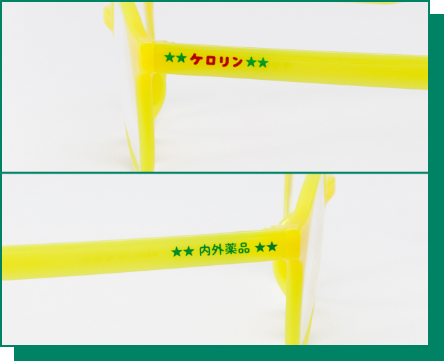 どのモデルもテンプル部分はケロリン桶を象徴する鮮やかなイエローカラー