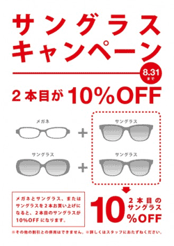 Zoff(ゾフ)では、メガネとサングラス、またはサングラスを2本買うと、2本目のサングラスが10%OFFになるキャンペーンを8月31日(火)まで開催中。