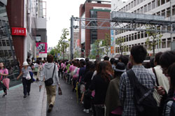 整理券を手に入れたひとは9時より列をなし、一時は明治通りから表参道に掛けて「軽い男」「軽い女」を書かれたTシャツを着たひとびとで埋め尽くされた。