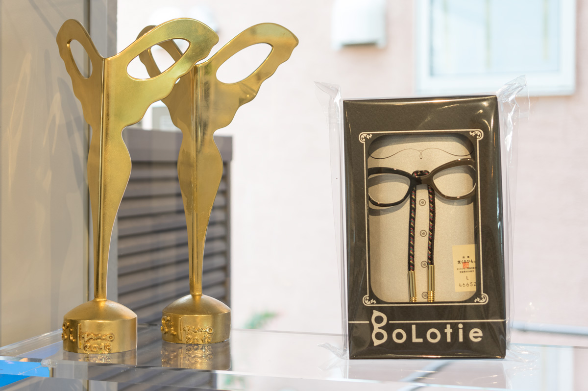 “メガネ界のアカデミー賞”SILMO D'OR(シルモドール)のトロフィー(左)とメガネ型の留め具を使ったループタイ(右)。