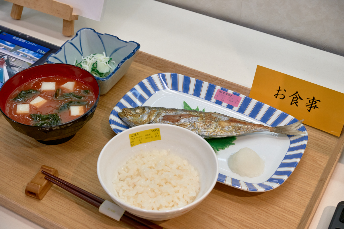 遠近両用メガネを掛ければ、魚の骨やご飯の一粒一粒などがよく見えて、おいしく食べられる。