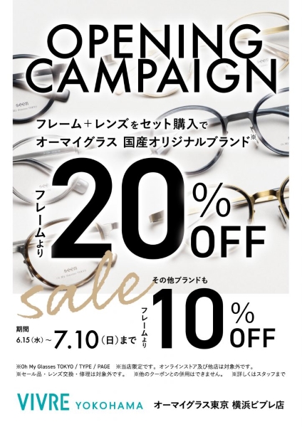 Oh My Glasses TOKYO 横浜ビブレ店では、7月10日(日)までオープン記念キャンペーンを開催中。オーマイグラス オリジナルブランドのフレームが20%OFF、それ以外のブランドのフレームが10%OFFで購入できる。