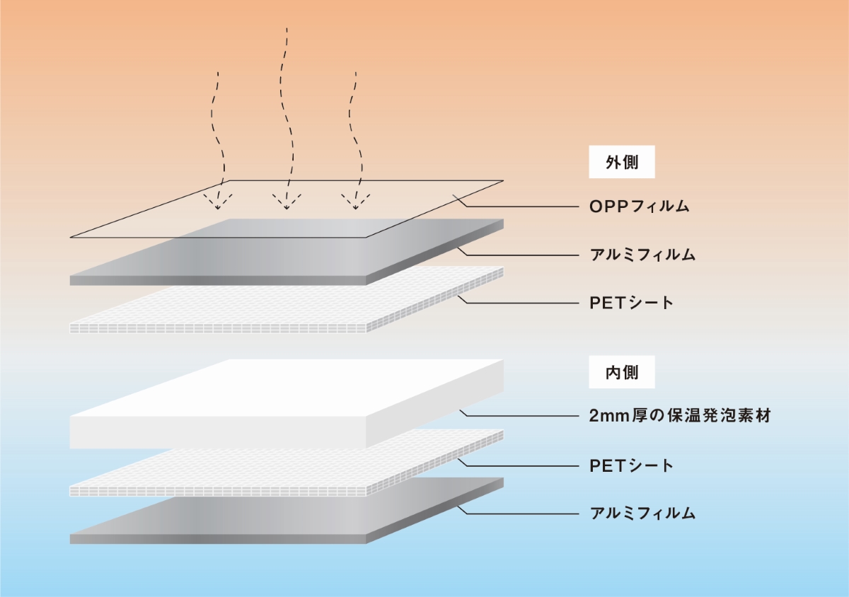2mm厚の保温発泡材をアルミフィルムで挟むことで、外部からの熱は遮断し、内部の温度はしっかりキープ