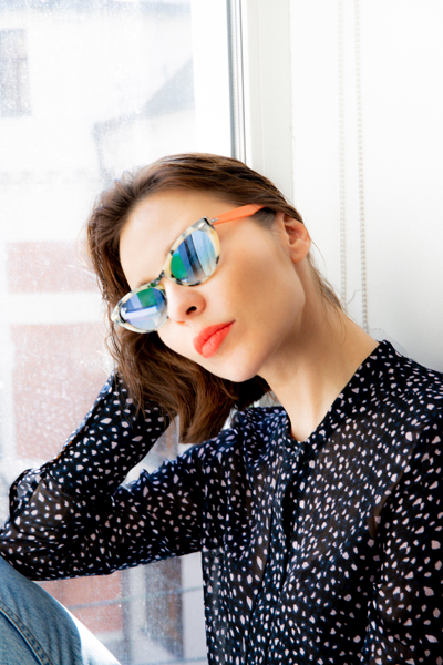 自身の芸術的な感性を表現するため、ニーナはライトブルーのグラデーションレンズとベージュハバナのフレームをチョイス。オレンジのテンプル(つる)がアクセント。