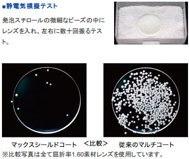 (写真2)東海光学「マックスシールドコート」と従来のコーティングとの比較。「マックスシールドコート」は静電気が起きにくいので、ホコリなどがつきにくいことがわかる。