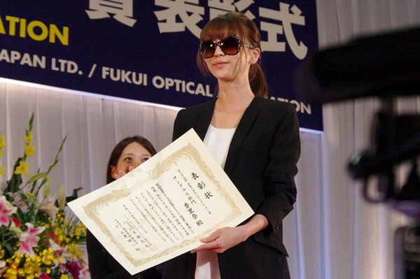 (写真1)第25回「日本 メガネ ベストドレッサー賞」サングラス部門の表彰状を手にする香里奈さん。