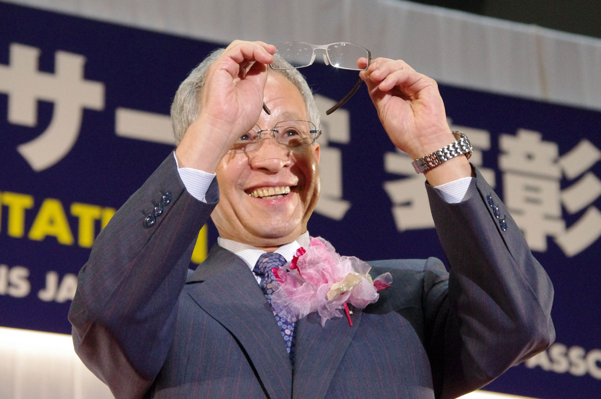 (写真1)第25回「日本 メガネ ベストドレッサー賞」経済界部門のトロフィーを笑顔で受け取る榊原 英資氏。