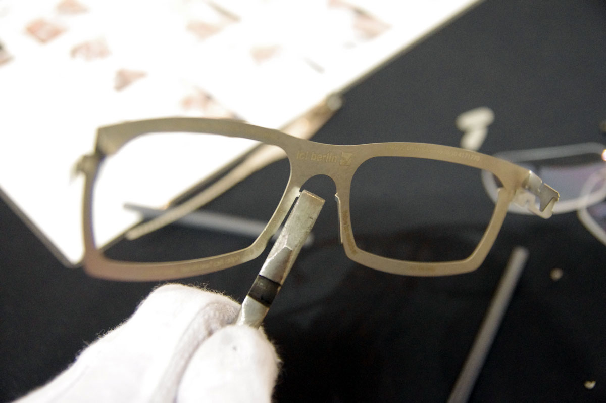 テンプル(つる)を取り付けたら、顔にバランスよく掛かるようにカタチを整えれば、いよいよ ic! berlin(アイシーベルリン)のフレームが完成!