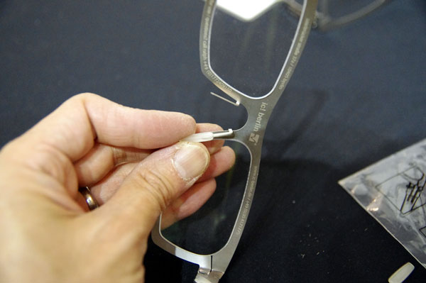 レンズをはめたあと、一般的なメガネフレームではネジでレンズを固定するが、ic! berlin(アイシーベルリン)の場合は、「メタルクリップ」でレンズを固定する。